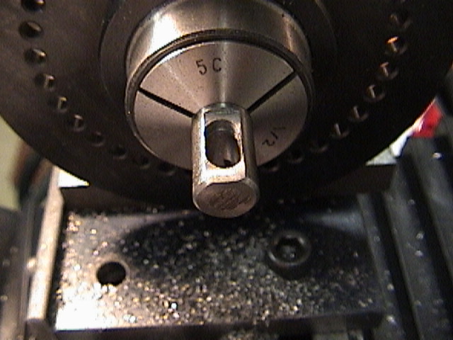 the drill in the hole, just ready to drill, the indicator is zeroed.